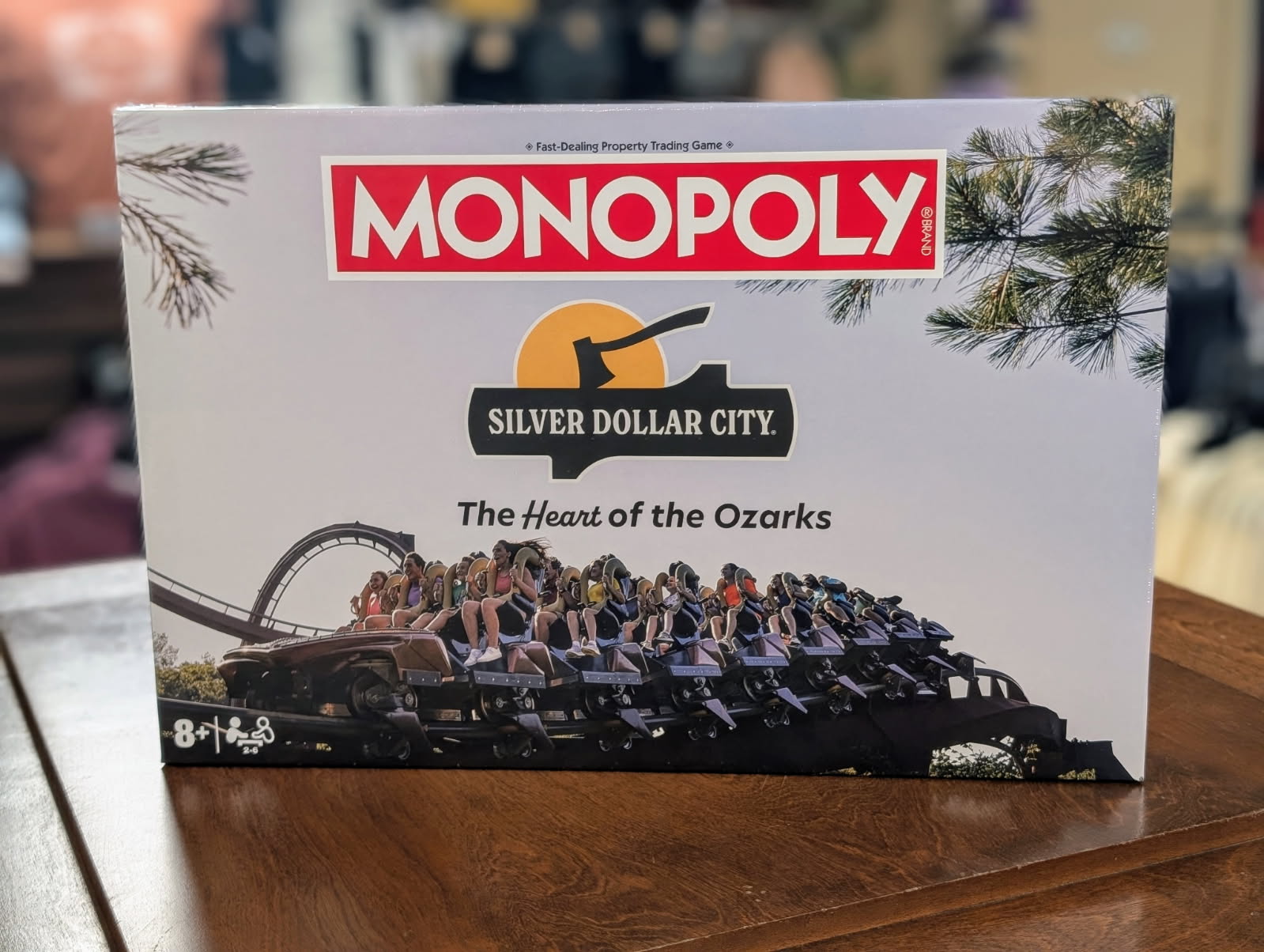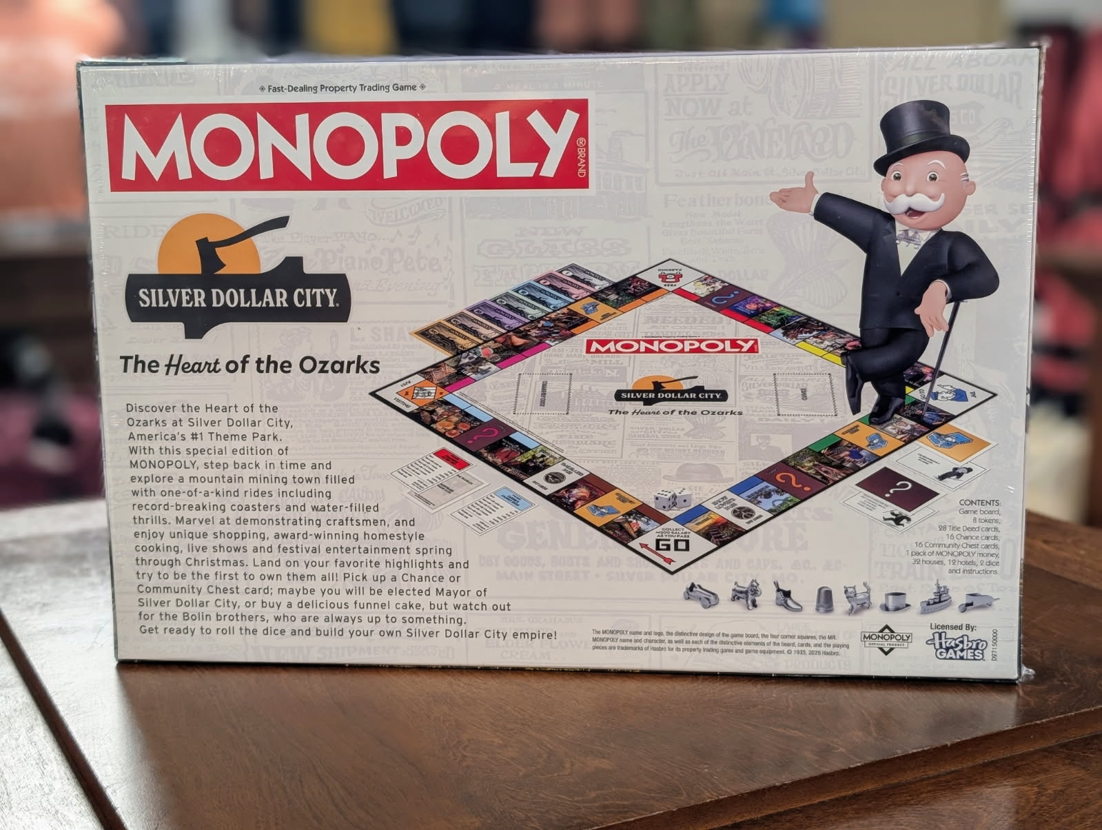 Discover the Heart of the Ozarks at Silver Dollar City, America's #1 Theme Park. With this special edition of Monopoly, step back in time and explore a mountain mining town filled with one-of-a-kind rides including record-breaking coasters and water-filled thrills. Marvel at demonstrating craftsmen, and enjoy unique shopping, award-winning homestyle cooking, live shows and festival entertainment spring through Christmas. Land on your favorite highlights and try to be the first to own them all! Pick up a Chance or Community Chest card; maybe you will be elected Mayor of Silver Dollar City, or buy a delicious funnel cake, but watch out for the Bolin brothers, who are always up to something. Get ready to roll the dice and build your own Silver Dollar City empire!